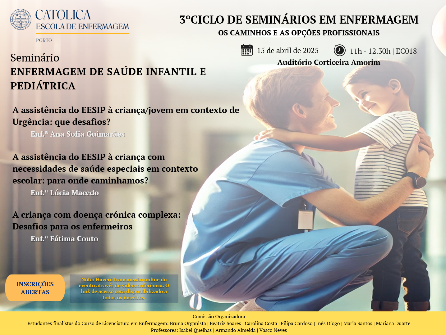 Os participantes terão a oportunidade de explorar diferentes vertentes da atuação profissional, com ênfase na Enfermagem de Saúde Infantil e Pediátrica. Neste seminário, serão realizadas três conferências conduzidas por especialistas que abordarão os contextos de assistência do EESIP à criança/jovem em contexto de Urgência e Escolar e a criança com doença crónica complexa: desafios para os enfermeiros. Este conjunto de apresentações evidencia o compromisso com a excelência na intervenção, ressaltando as múltiplas possibilidades de desenvolvimento na enfermagem, preparando os profissionais para enfrentar os desafios de uma prática em constante evolução.