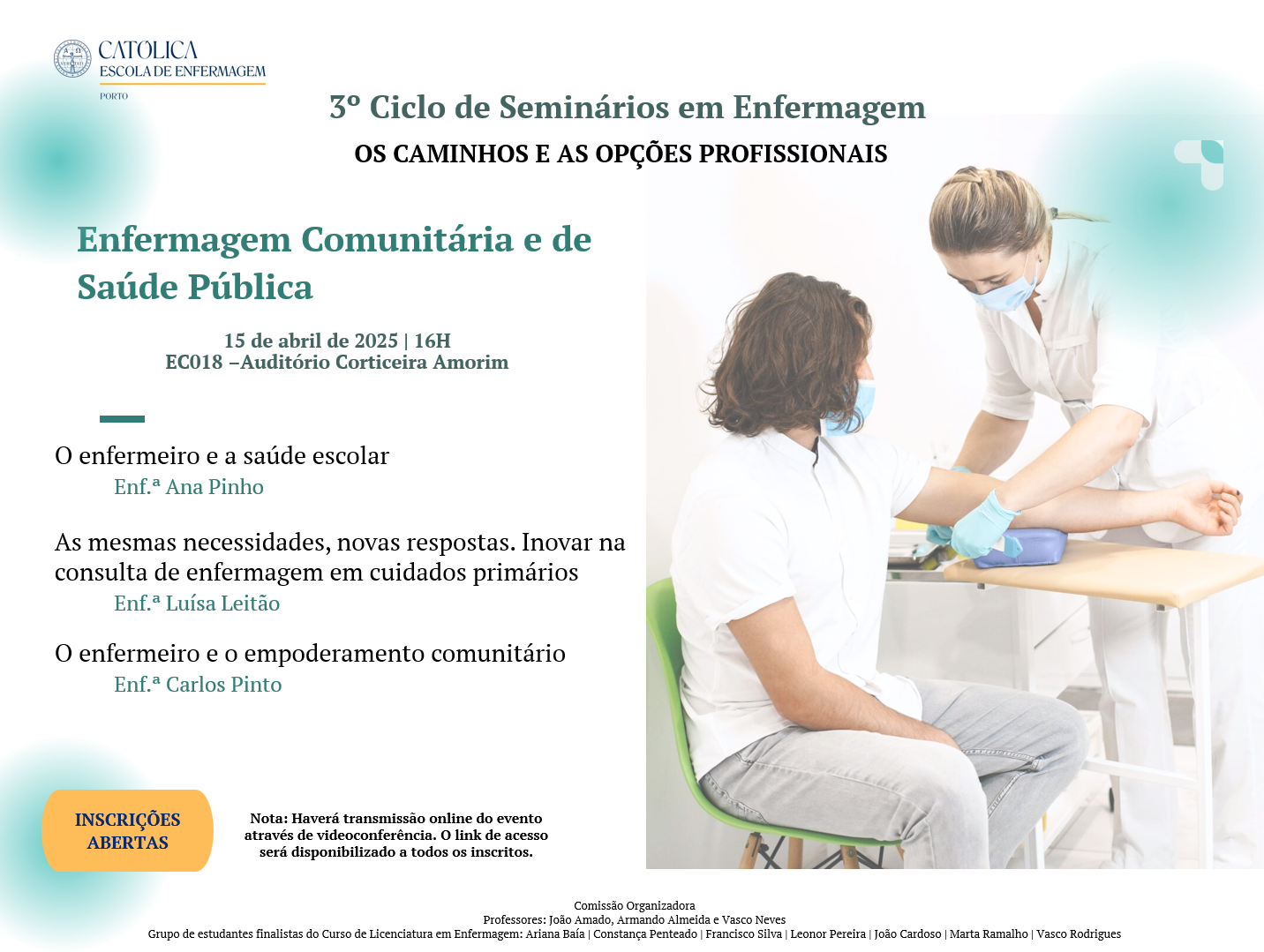 Os participantes terão a oportunidade de explorar diferentes vertentes da atuação profissional, com ênfase na Enfermagem Comunitária e de Saúde Pública. Neste seminário, serão realizadas três conferências conduzidas por especialistas que abordarão os contextos do enfermeiro e a saúde escolar, a consulta de enfermagem em cuidados primários e o enfermeiro e o empoderamento comunitário. Este conjunto de apresentações evidencia o compromisso com a excelência na intervenção, ressaltando as múltiplas possibilidades de desenvolvimento na enfermagem, preparando os profissionais para enfrentar os desafios de uma prática em constante evolução.